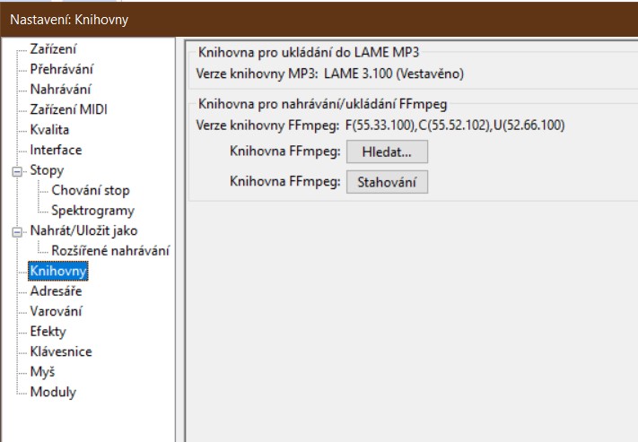 Úpravy > Nastavení > Knihovny > pokud je verze knihovny FFmpeg nějaký údaj - ok - viz obr., jinak je potřeba vyhledat (C:\Program Files (x86)\FFmpeg for Audacity)